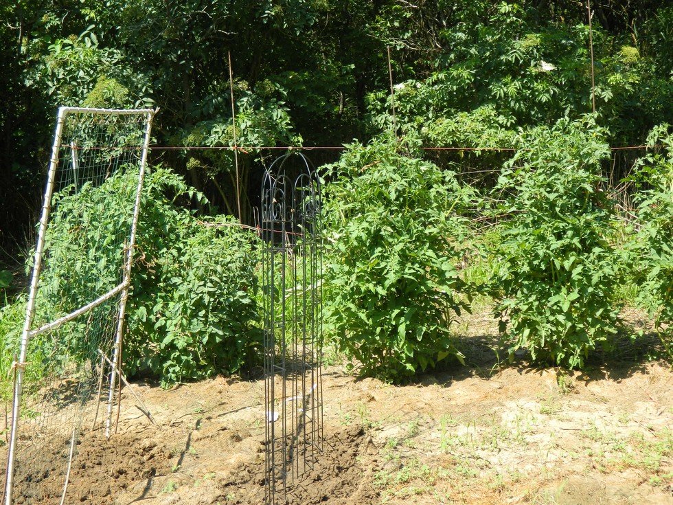This patch of tomatoes is doing great. Some plants are over ' tal. The pole beans were replanted after the rabbits ate them. I will have to fence them.