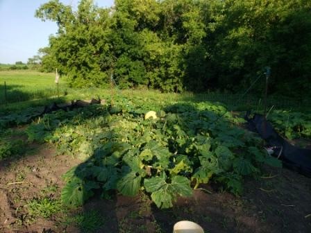 Here is a pic of the plants 4 days post apocalypse. In the middle is the 2075 Connolly(best one going and took the brunt of it). The 2075 plant was 38ft wide at the back and the main was about 35ft long, with the kin set at about 18ft. As you can see most of the leaves over the main are layed over/ snapped. Back left is my 1576 Johnson(pumpkin really slowed down). and far right 1852 Qualley(not much going on, was a slow plant from the start).