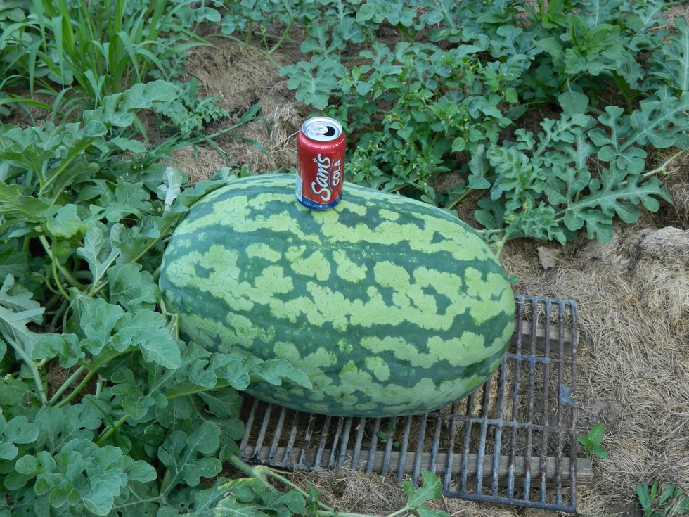 All of our watermelons are pollinated by bees and we just started seeing the little melons show up after the 4th of July. So they are now about a month old. This one measures 135", 73.5#.