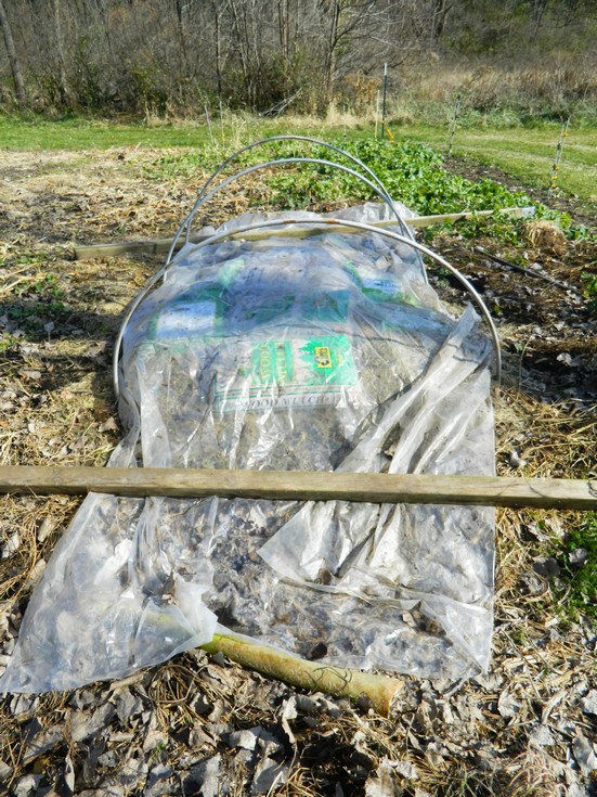 Fall patch prep. This will be our early state fair plot. The plant we pulled was growing where the green radish/turnip crop is growing. This plot was tilled with the fork in August and seeded to the cover crop. In late October I mowed and tilled again and spread about 300# of chopped up small pumpkins. Then we added some grass clippings and leaves and covered it with compost. Then it was a half truck load of grass and leaves, bags of wood mulch and potting soil to insulate it and then covered with plastic. We hope to keep the soil from freezing too deep. In March we will clear the site and put up the hoop plastic to warm it up fast.