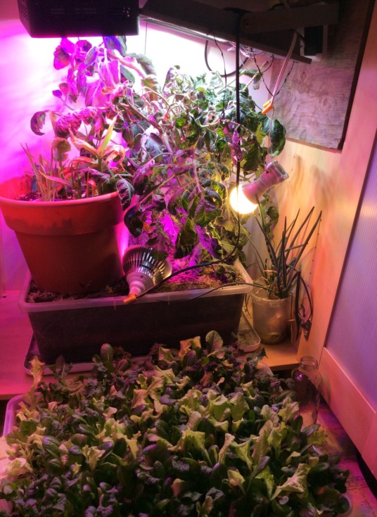 My 3rd world setup. I'm behind on eating my greens. Excess nitrogen and probably excess potassium too. I'm going to try watering a small amount, daily, to try to reduce the moisture flux & blossom end rot. Giving a gallon every week or so was convenient but causes too much moisture fluctuation I guess? Even though the plant was not getting bone dry or wilting, the water fluctuation did help ruin the last tomato.