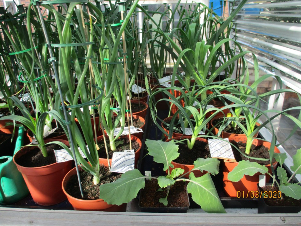 Kohl Rabi now being potted on into 5 inch, they are in OG cabinet with exhibition Onions, all these now in 7 inch pots M3/JI2 and supported by canes and clips.