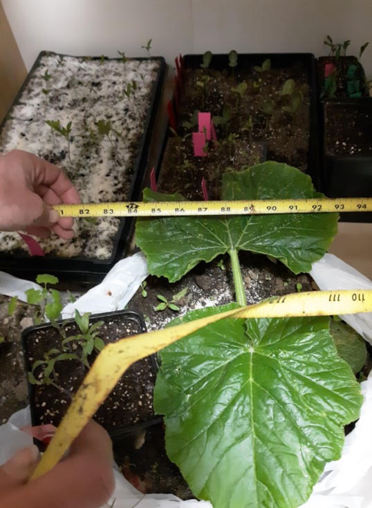 The 972 Marvin squash has the largest first leaf (in back) I can remember its 9 inches across. It's a good plant so far. 356 Borgers is smaller but healthy. Nevertheless-- I wish I'd planted three 356 Borgers seeds and chosen the best of them.
