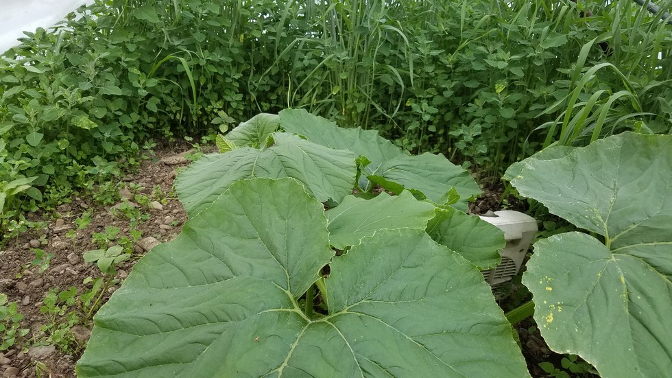 I'm a bit behind schedule but the weather forecast is finally looking decent. I plowed up a spot that has not had pumpkins since 2013, and had been turned into pasture since then. Amazingly, the weed seeds had survived. Looks like all of them survived. Once this plant outgrows the greenhouse, I'll probably do one last till and mulch the whole site to keep the weeds down.