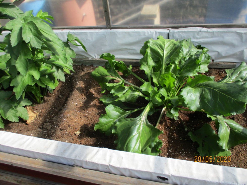 Giant Beetroot has grown in the last month or so. Weather has been extreme - two -3c air frosts, three days of gales, now weeks of 25c + sunny days.