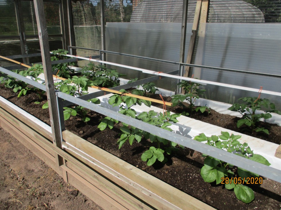 Planted out giant Potatoes into my front frame but just with the roof on, tied up halums to timber rail to keep foliage upright.