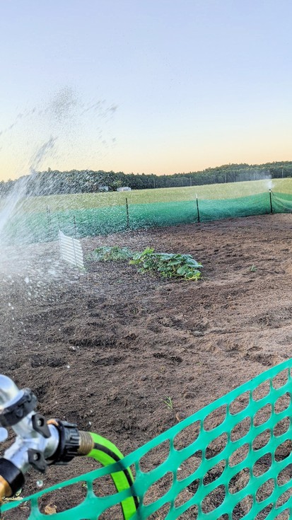 We have plenty of water. Whoever coiled the 2" line up last did not properly drain it. When we turned on the irrigation. I was a little disappointed at the amount of water covering the patch. Then I looked to the right and saw the geyser. A couple of splices and 10 feet of pipe removed. We were back in business. We have three spigots with a 45' Radius each covering the 50' x 50' patch. We did a test run for 30 minutes and threw 600 gallons of water out. Which I am very happy with. I need to learn how to properly turn the fertigator off as I threw about 10 lbs of CalMag Fertilizer down also. It was not until the end when I filled a bucket we realized we had Blue water.