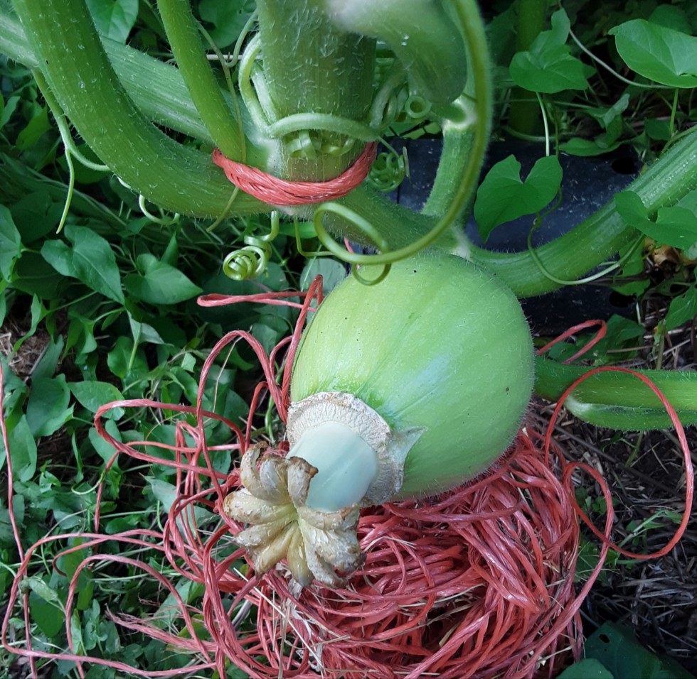 Marvin squash. Small split. 5 DAP. Appears light green at the moment.