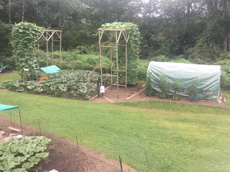 The old patch is coming along and the long gourd trellises are almost filled. The trellises are 4 feet wide and 14.5 feet tall with a 12 foot long top. This gives each plant 106 square feet if they just take up trellis area. We currently have 2 pollination attempts on the 143.75 Vanderwielen and 7 pollination attempts on the 139 Ansems.