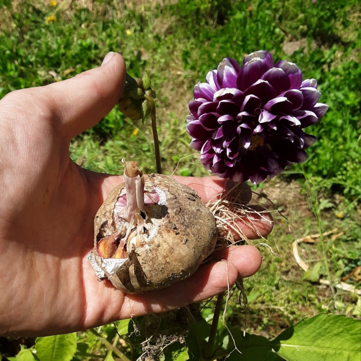Purple garlic, purple dahlia. The garlic did well with no irrigation. The dahlias would be doing better with irrigation. I planted the garlic about 6 " apart. I wonder if I could space them at 3 or 4 inches... maybe it would be good to try growning them with plastic mulch.