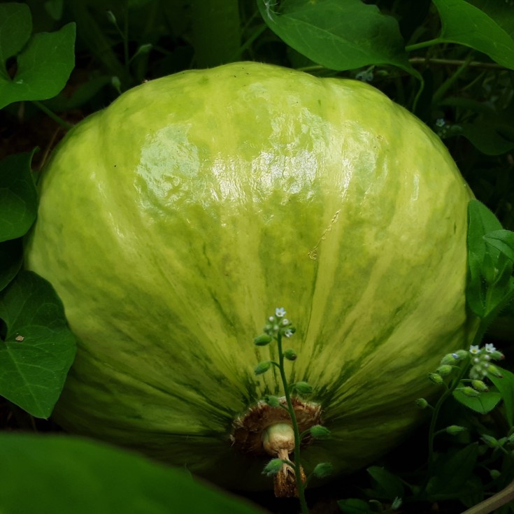 Seed exchange edible squash are breeding true. One of the lovely kobochas on very healthy plant. Acorn and delicata are producing too. There was a 4th. Not sure if the 4th one grew.