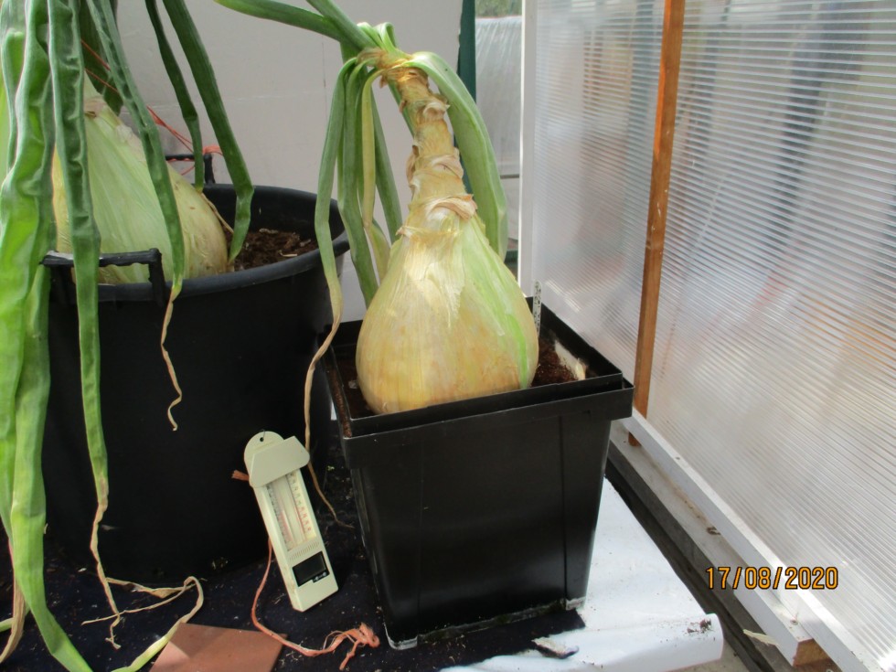Grew a later Onion in small pot (22litre) to see how it would turn out, pot filled with Coir and watered from the bottom with Canna A & B feed. Finishing but has reached 28.5 inches circ. so far.