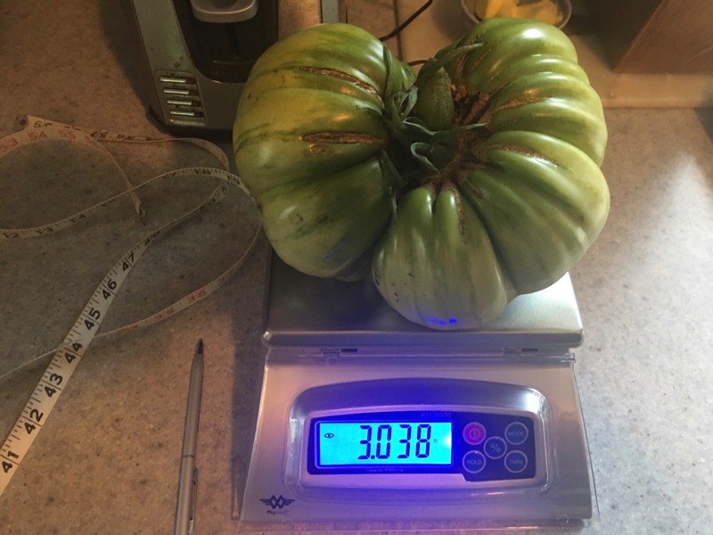 We harvested 3 tomatoes this weekend. The first is from the 3.99 Sandercock and weighed in at 3.03 pounds. Thanks for the seed Ned!