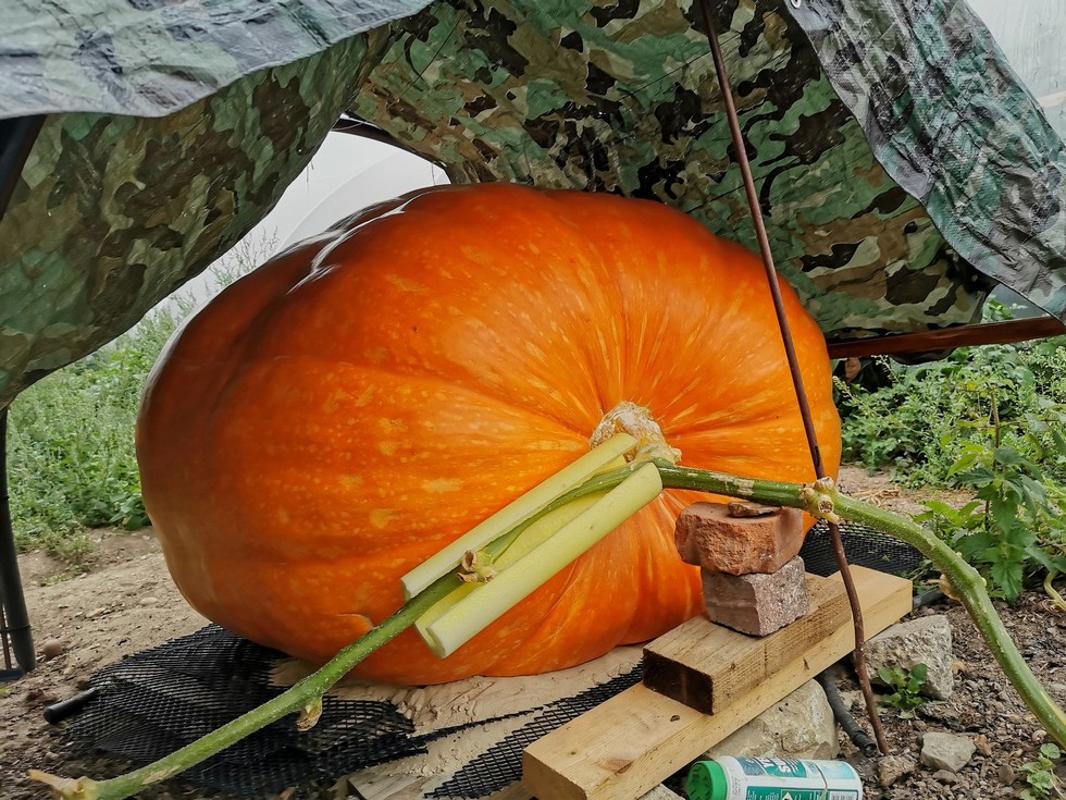 Note to Newbies Always put sand under your pumpkin in a wet location.Eri did not have sand under them just a mat .This is a 1734.5 Clementz offspring from 2015 grown this season by Ben White