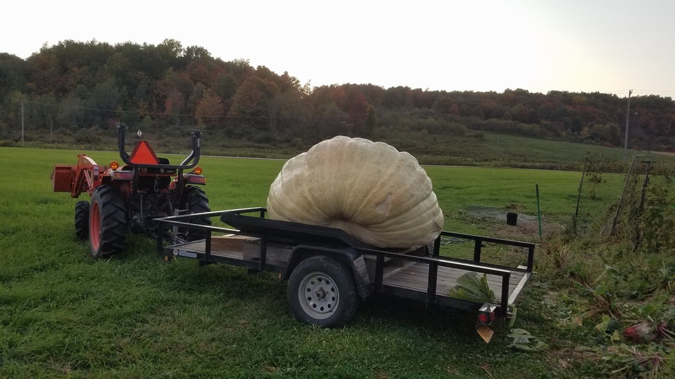 Amazing pumpkin to grow - first one I ever hit 50# a day on. Went through the effort to tent the pumpkin, and then the entire plant in preparation for the mid-September frosts. Unfortunately when I was gone for the KY weighoff, Amelia accidentally pointed the little heater directly at the fruit. When I checked it when I got back, it was cooked. You can see the two spots in this pic from the day I picked it. They were cooked / dehydrated enough to sink in. By the time I weighed it today, the fungus had started to set in. Between stopping watering, the cold September, and picking early, it probably would have normally been about 50 pounds heavier.