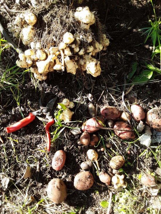 Another smashbang awesome find today... was these Jerusalem artichokes. And they seem to get along well with potatoes... which is a surprise. All these potatoes came out of the ground on the same pull!
