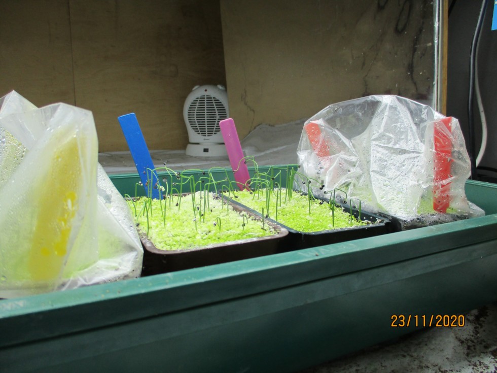 Second sowing Onions have germinated in my propagator and now moved under 24hr T5 lights. Only sowed 30 of each but it looks as if most are showing, Blue and Purple marked seeds are first.