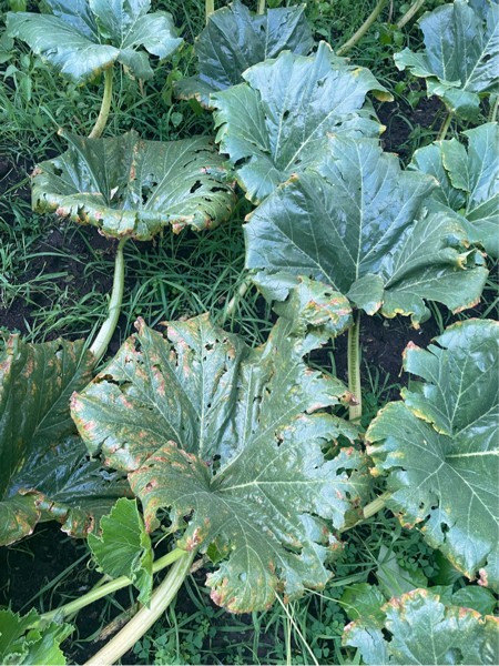 A perfect example of how luck is not on my side this year. I go to pollinate my second chance pumpkin yesterday and I get hail damage a few hours later. Never have I seen hail before. This year is not meant to be. Several leaves worse than this