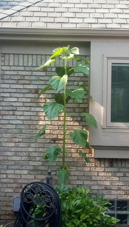 My 5 gallon sunflower is almost up to the gutter now. I keep the pot in the shade behind this peony plant so that the sun doesn't heat up the pot and cook the roots of the plant.