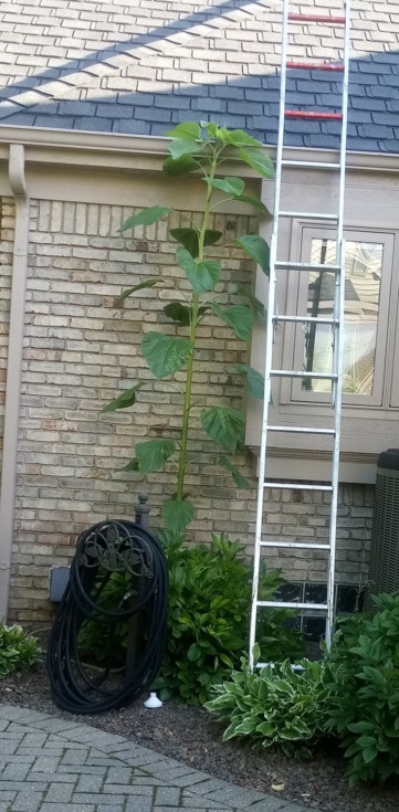 Well i decided to measure the gutter for a bench mark and the top of the gutter is 9 feet 6 inches to the ground. The dirt level in my 5 gallon pot is 8 inches deep. So that makes my 5 gallon sunflower plant 9 feet tall right now and still no flower bud. I think John Buttler is still the guy to beat, he is about 3 weeks ahead of me and he is around 15 feet right now. As long as i dont get a flower bud to early i hope i can give John Buttler a run for his money !!! I am now hoping that i will get 20 feet or more from this plant !!!