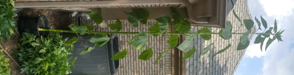 Here is a shot behind the peony plant so you can see the 5 gallon pot my sunflower is growing in. The plant is 13'-6" from the inside the pot at the bace of the roots.