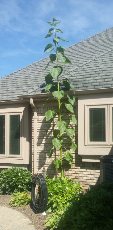 My 5 gallon sunflower is about 15 feet now. It's about full size now maybe 6 more inches to go when it flowers.
