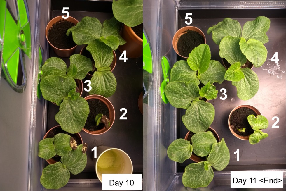 Day 10 and 11, (no day 9). Bringing the limited scope, highly floored experiment to an end. My main observation is that there�s perhaps an optimal seaweed dilution to be had, more is not less in this case. The Gibberellic Acid solution certainly produced stronger plants although they did germinate quicker which gave them a growth advantage over the 11 days. Seed germination using Gibberellic Acid was low, only 50%. Time depending I might rerun the test in the next few weeks. 1. Control (10ml Water) � 75% Germination 2. 2.5ml Seaweed Solution + 10ml water � 75% Germination 3. 5.0ml Seaweed Solution + 10ml water � 75% Germination 4. Gibberellic Acid 1000ppm + 10ml water � 50% Germination 5. 2.5ml seaweed solution plus sequestered iron (Maxicrop)� 0% Germination