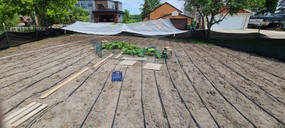 Final till is done and drip line installed--looking like a real patch suddenly. Also buried my first nodes on the 1885. We need warmer temps and calmer weather. My oldest leaves have been shredded by the wind or been snapped off and growth has stalled out badly. I'll make a final call on the 2nd plant tomorrow.