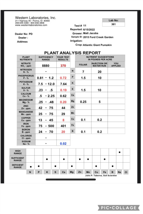 2015 Ford Tissue test. Glad I tested, the N deficiency was a big surprise. I�ll be switching back to 24-8-16 for a few weeks on the drip(6cups/1000gal) and if I can catch a rain, top dress w/1lb of Urea/plant