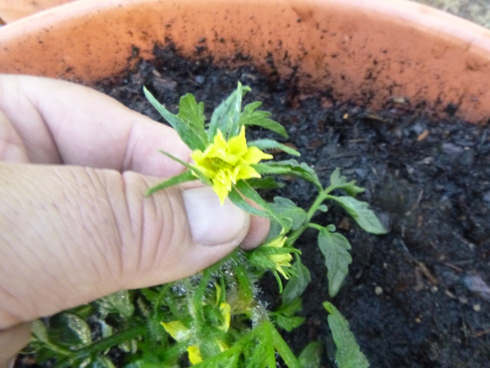 Mega Bloom on Cherokee Carbon plant. Didn't expect this. This plant is about 6 inches tall. Hopefully, the tomato will grow bigger than the plant.