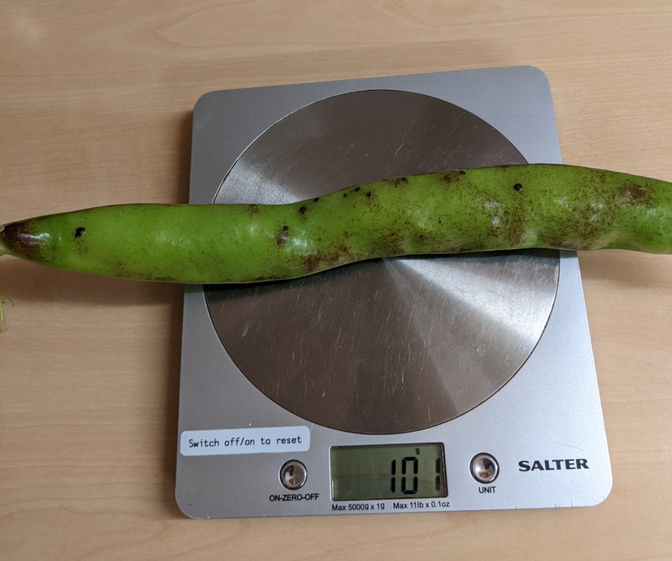I picked my broad beans today and one of them was just 5 grams short of the world record! World record is 106 grams and this one was 101 grams. Another one was 88 grams. I'll have to try that variety again next year!