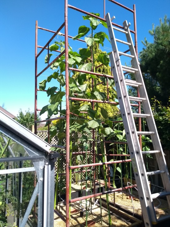 The Sunflower patch at 75 days post-germination Not a great week for the big yellows, all three remaining plants in the main bed have started flower initiation, even seed 'C' which I was convinced would go well into September. That said, the backup plants are taking advantage of what is becoming a decent couple of weeks of weather with highs of 30 degrees, so there�s still an opportunity to grow a PB.