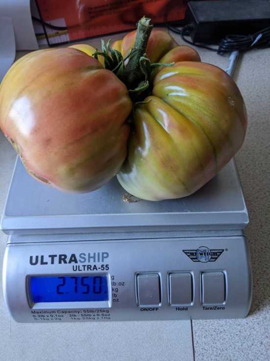 A new PB tomato at 6.06 lbs. (2.750 kg. x 2.205). It had a 25" circumference so it was just a little bit heavier than estimated (est. 5.5 lbs.). This was from some Domingo seeds I saved from last year.