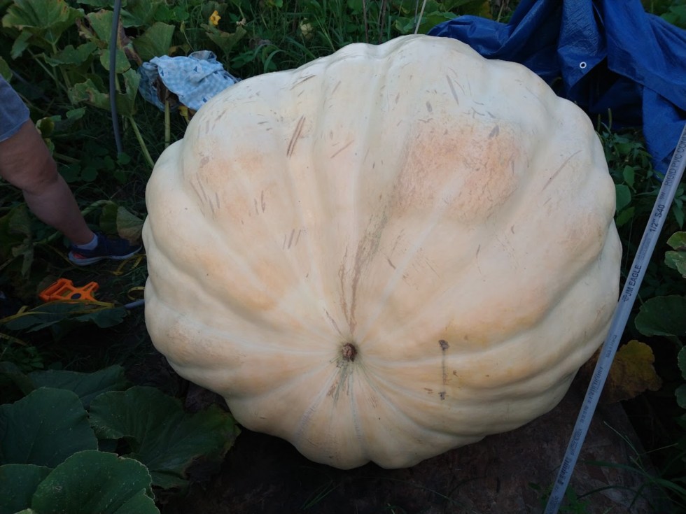 Final pic of the 705.5 before carving it up to get it out of the garden. When cutting it up several of the seeds had already germinated so had been dead for a while. Taped 923 lbs when it stopped growing. We weighed each piece when hauling it out and came up with 922.6 lbs. Lost quite a bit of liquid/ooze that ran out while carving it up and pretty sure it lost some lbs from the time it stopped growing earlier in the month so realistically it was probably a little over chart when it was still healthy. Will probably try this one again as it was by far the fastest growing pumpkin I've ever had until it aborted for some reason.