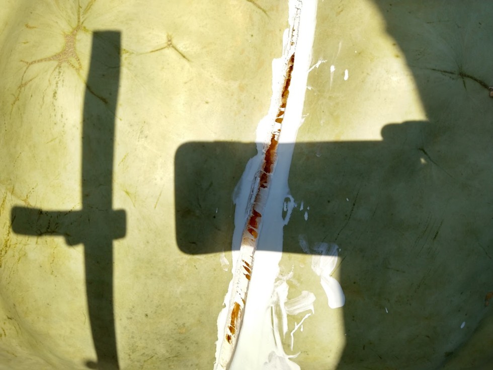 Looks like we should have weighed the big squash yesterday instead of trying to get another week out of it. As soon as I saw this cut the vine to stop anymore growth. Couple inches deep so will have to nurse all week to keep it sound for Anamosa.