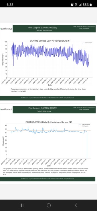 So this past season I spent a little money. I found a sensor, that told me soil moisture, ec, humidity, air temperature, and soil temp. It graphed ot out really nice and I was able to monitor from my phone. The bottom graph is where the 2424 hung out in moisture. Every little spike was a rain. Took about 200 gallons a day to keep in that 35 - 37% range