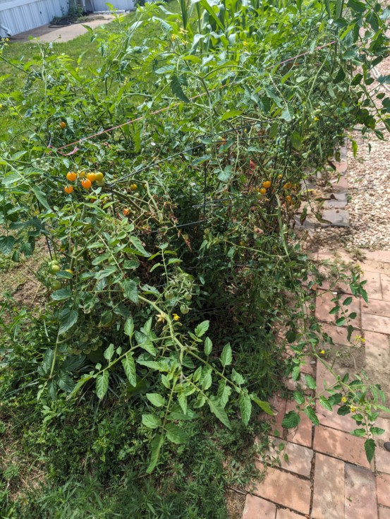My wife. "STOP fertilizing the eating tomatoes!!!!! Seriously..." As they over take the walking path to the back door. 2 plants sungold and stipice. probably around 300 tomatoes set between them :)). :)) And yes today is the day!