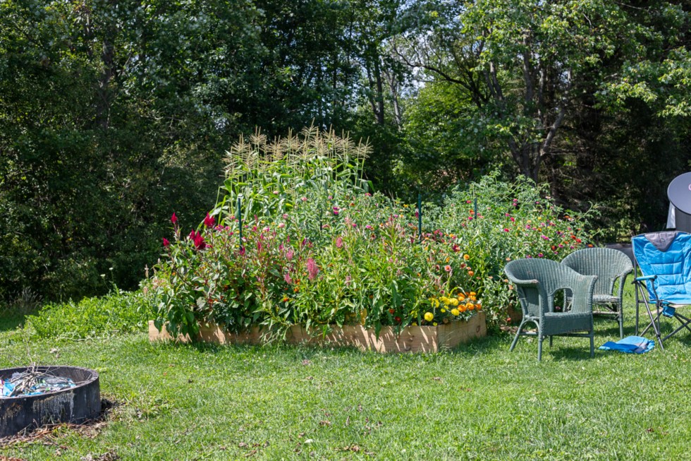 The raised beds became flower beds.......There is Tomatoes in there somewhere but with all the bees around I can't look. So they are becoming food now. Won't do that again.