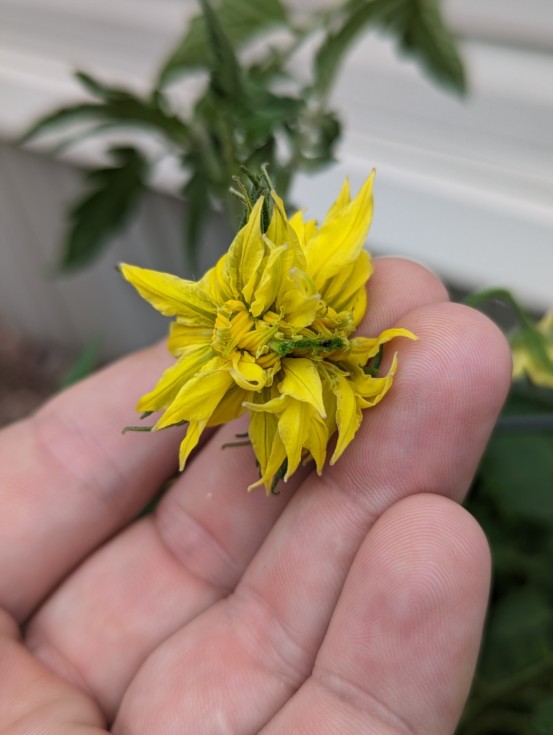 Another crazy megabloom. This one is on a tomato plant I randomly put at the top of the strawberry box in the part where the strawberrys didn't come back. It was a seed from the late tomatoes that missed the weighoff last year. (Smiling heart, twin singles etc.). I'll hand pollinate it and see what happens. Lol