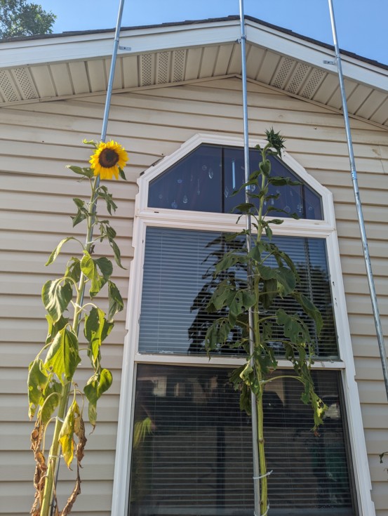 The sunflower experiment didn't turn out too bad. 9+ feet. They were planted on the south side of the house and I think they may not like THAT much sun. They wilted during the heat of the day when it was over 85. I guess they are partlysunflowers. The grasshoppers like the leaves a bit also. It still neat to see them in bloom. I'll plant them again. (In a less sunny spot lol)