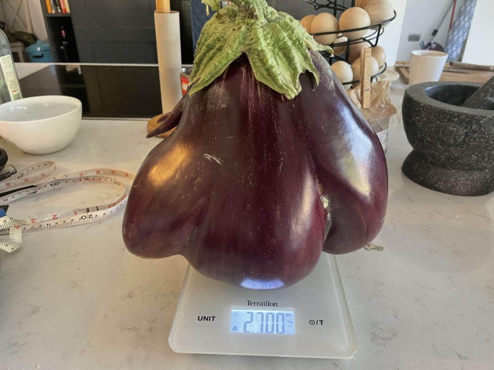 Oh no; calamity for one of my giant aubergines that was a contender for Malvern. Slipped it�s sling, and separated from the top with 3 plus weeks of growing left in it. A new pb for me 2.7kg.
