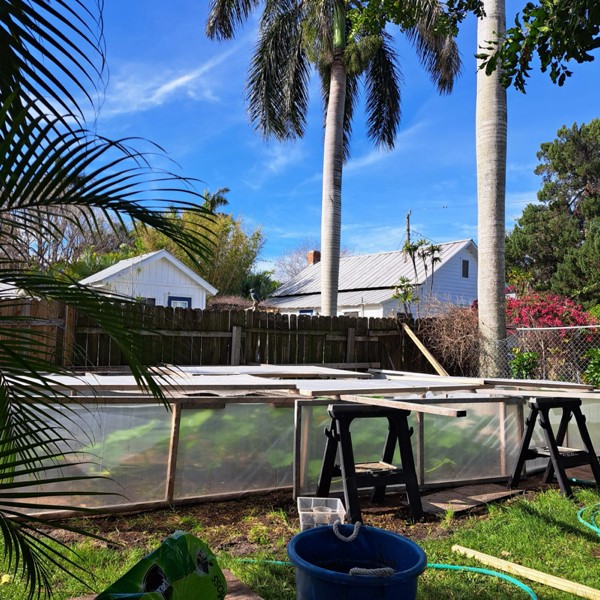 Tim decided to extend his greenhouse. He said it's a combination of Beverly Hillbillies and Sanford and Son. Deck screws, duct tape and a electric stapler does the job.