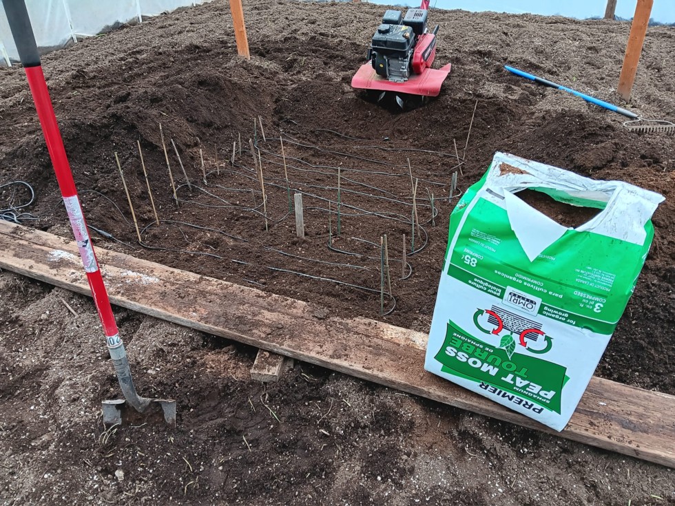 I got the soil heating cables into the green house. I use gutter de-icing cables plugged into a thermostat that has a soil temperature probe. I also mixed in about a cubic foot of peat moss into each planting site.