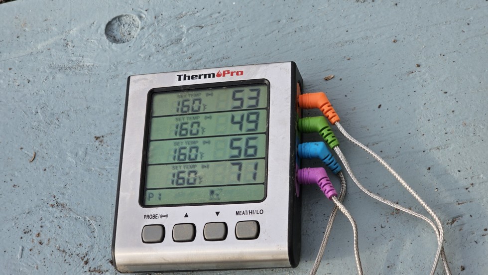 It's nice to know if your hard work is doing something. This meat cooking probe thermometer is ideal. Top temp is outside air. 2nd is outside soil temp. 3rd is inside hoop air temp. 4th is inside hoop soil temp over heating cables. Ready for the babies.