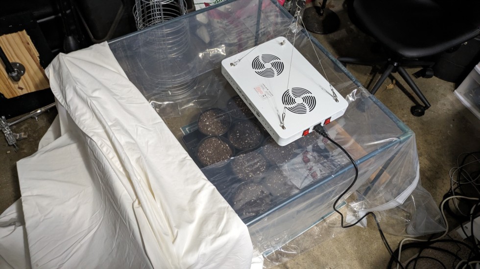 The new starting rig. We now have a proper grow light and plastic pots. Soil is Promix BX with some worm castings mixed in. I'll sand, soak, and start the seeds tomorrow!