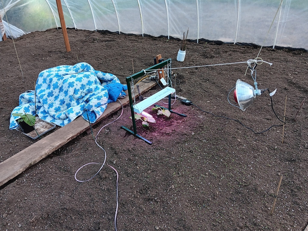 I am trying something diferent with the 1931 Turner. I experimented the last couple of nights with putting a large plastic tub over the planting site with a heavy quilt over it. The heat radiating up from the soil heating cables kept the air temp in the tub above 60 degrees while the air temp in the greenhouse was in the low 40s. I am going put the tub over the plant once the sun goes down and take it off again in the morning. I'll try that a try for a few days and see how it works. Obviously I won't be able to do it too long before the plant out grows it. The 639.5s will get the heat lamp on them. I am also putting the grow light over them for a few days.