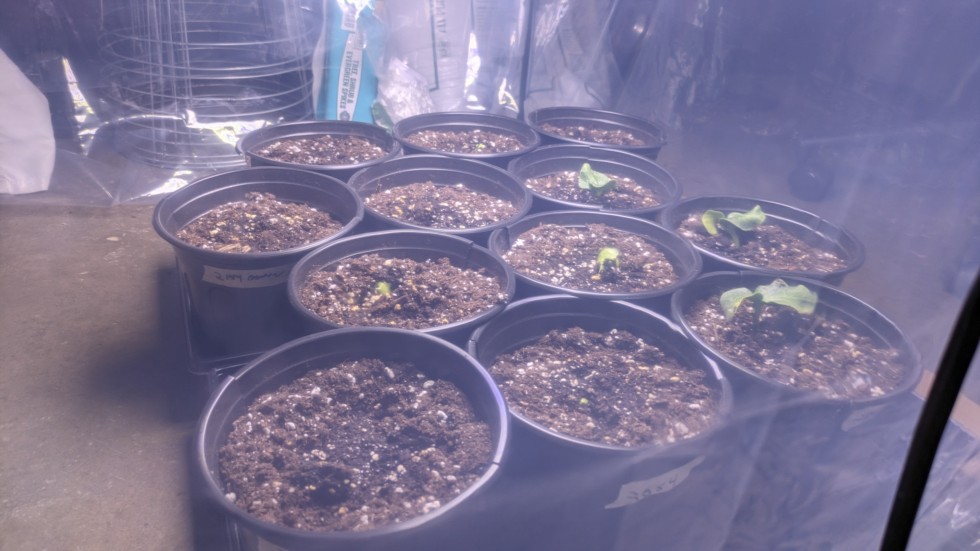 All the little guys are starting to come up. First was 2054 Strickler which I'm very happy about. The 25% heavy Barker seed came up as well so I'll be trying that as a pollinator. It's not done anything spectacular for anyone else but I guess I'm just playing the numbers. I'm really happy with the light I got as you can tell they aren't trying to reach on me. Today I got half the patch tilled and amended and...well mostly covered. My plastic sheeting isn't quite big enough.