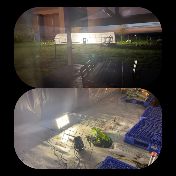 Today I added grow lights in front of the plants to try and draw the main vines forward. Right now both are reaching for the stars! I was amazed how bright 2 grow light can make a greenhouse!