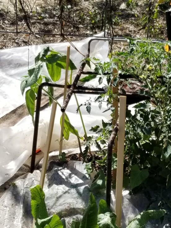 Sunflower update. Looking a bit bedraggled... the volunteer tomato to the right is growing like a weed.