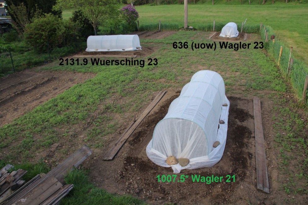 Patch today :) Now the exciting time begins. This year I decided to start the seeds a week later than usual, because in past years I made the experience that after transplanting weather had been cold and cloudy for a while and the seedlings were just sitting rather than growing. Good decision, this year it was cold and cloudy around April 20th, but since yesterday we�ve got plenty of sunshine, nice warm weather, and forecast looks great for the next five days. Hence, today the seedlings (which are just about showing their 2nd true leaf) went into the patch. My line-up is: The usual 1007.5* Wagler squash (and my kids will be growing their 989.3* Wagler squash), my 636(uow) from last year (it is 1944 Connolly x 1908.1 Baumert, I think there should be some great potential in that seed, time will tell) and, last but not least, 2131.9 Wuersching. The latter is for both big-and-orange (hopefully) and as a reference point in terms of potential for comparison with my 636.